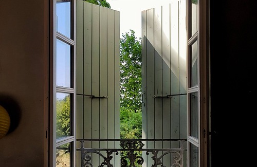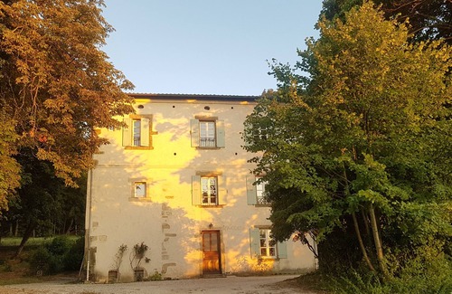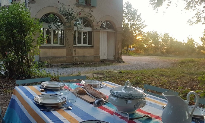 Located in the heart of nature, and only two kilometers from the city, our house is a haven of peace. It is an old silkworm farm (where silkworms, the wealth of the region, were transformed into silk thread in the early 19th century). It is surrounded by a walled plot of about one hectare, planted with century-old trees and meadows. A rock fountain, now in flower, and old yew trees enhance the view from the house.