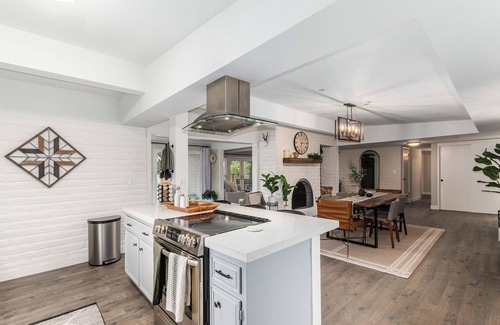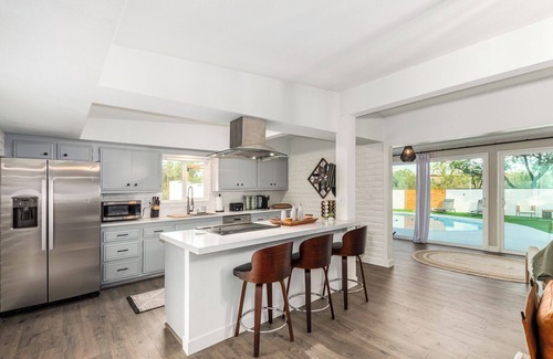 Inside the home you'll find a spacious living area with an open-floor plan and dining table for 6 people. The open kitchen has 3 additional stools situated beneath the large island for additional seating. While there are some great dining options in town, our kitchen is stocked with all the basics you'll need to cook you and your family a nice dinner. Included a Keurig coffee maker with a variety of coffee pods and creamers. Toaster, blender and cocktail station. If you notice a basic is missing, please reach out! Also, enjoy outdoor dinner cookouts fully surrounded by mesquite trees and mature landscape. Dinner table for 6 and propane grill.