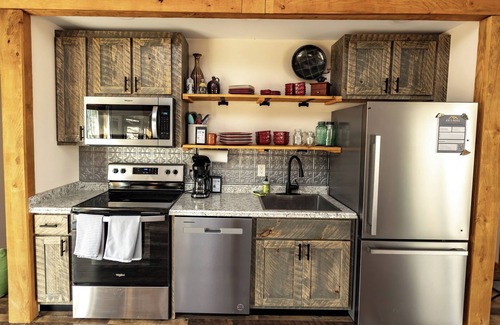 Check out this modern cabin in the woods! A two bedroom cabin, perfect for the whole family. Sleeping up to 7 with all the comforts of home, even a fully equipped kitchen.