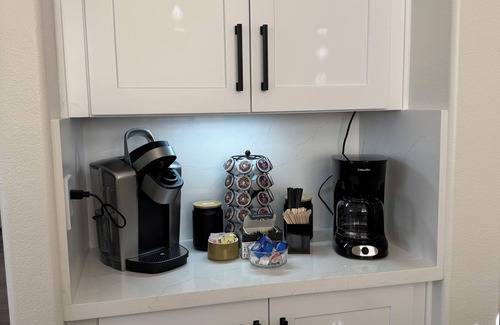 The updated chef's kitchen features stainless steel appliances, a spacious island with bar seating, and ample counter space. Whether cooking or enjoying takeout, this kitchen is perfect for gathering. Amenities include a Keurig K-Cup and drip coffee maker, toaster, blender, glassware, plates, cups, utensils, and more. The dining table and breakfast nook each seat 6, accommodating 12 in total.