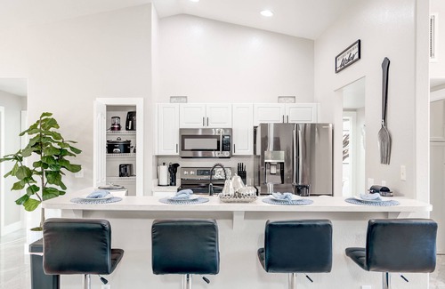 The home features an array of exceptional amenities designed to cater to your every need. Imagine exchanging vows surrounded by a lush landscaped backyard, complete with a screened heated pool and rejuvenating jacuzzi—perfect for unwinding after the festivities. The fully equipped kitchen is perfect for catering your event, offering ample counter space and high-end appliances to prepare delicious meals. After the ceremony, gather your loved ones on the outdoor patio, which includes a dining area for six and cozy seating arrangements. You'll find luxurious bedrooms, each equipped with smart TVs, ensuring comfort for both you and your guests as you celebrate this significant milestone.