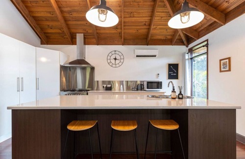 After a day of water sports and relaxing somewhere along one of the many gorgeous Sunshine Coast beaches, come home and enjoy a wine in the private back yard while you prepare a meal in the fully equipped kitchen with an island bench or on the BBQ. The alfresco dining area which looks over to the pool and out to the bush offers peaceful family dining with rustic charm.