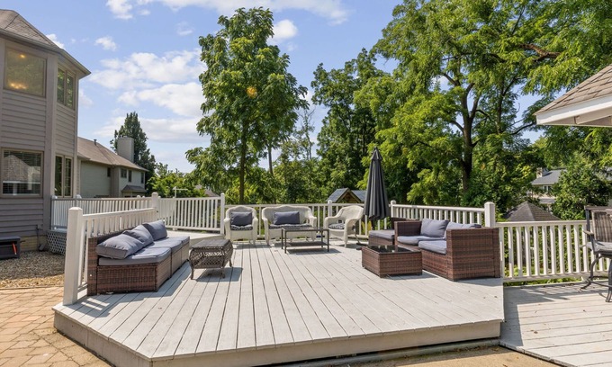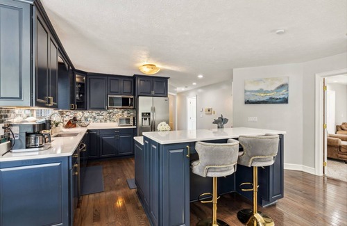 This stately home in a family-friendly neighborhood features three floors of living spaces, 6 bedrooms, 3 bathrooms, multiple lounging areas, and lots of outdoor fun! The first floor features a beautiful open-concept kitchen with stainless steel appliances, island seating for 2, a kitchen table for 4, and a large kitchen pantry. The kitchen boasts natural light and great views of the backyard. The kitchen flows into the family room with a cozy, power reclining couch and large Smart TV with surround sound. Flowing from the other side of the kitchen is a dining room with seating for 8 + a high chair. There is a den on the first floor with a queen bed, private desk space and large TV. The first floor also has a living room with comfortable seating, a half bathroom and laundry room.