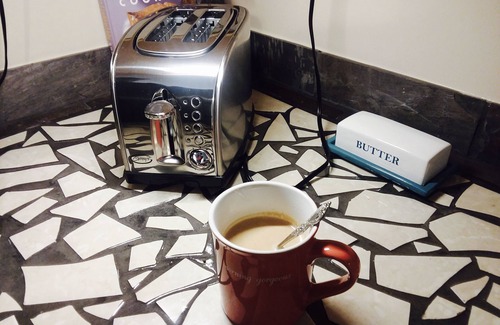 Enter the house through the French doors and you're inside the fully equipped kitchen, side-by-side refrigerator, dishwasher (there is dawn and dishwasher detergent under the sink), tempered glass topped stove, microwave, toaster, dishes, pots and pans and utensils, and my favorite, the coffee station!! Here you can brew an entire pot or use the Keurig to brew coffee, tea, or cocoa by the cup. You'll also find a fully furnished, complimentary, k-cup tree, cream, and raw sugar & stevia. There is also a snack basket.