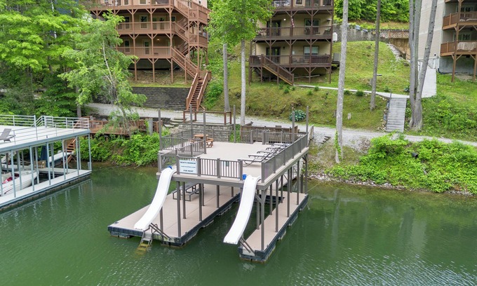 Spend your days on the 2-story dock with two water slides, swim in the cove, or relax on four spacious decks. Evenings are for grilling, soaking in the hot tub, and gathering around the fire pit.