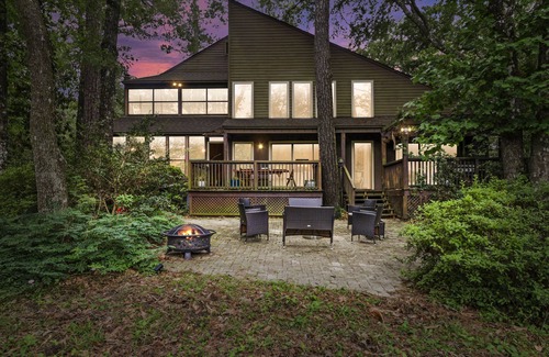 This charming property features two distinct housing arrangements under one roof, including a spacious two-story chalet-style home and an adjoining suite. Accommodating up to five couples, the main house boasts three full bedrooms and 2.5 baths, while the suite offers two additional bedrooms. Enjoy cozy evenings by the floor-to-ceiling fireplace or relax on the sunny screened porch. The large main room is ideal for gatherings, and outdoor amenities such as the stone patio with comfortable seating, fire pits, and a 4-burner flat iron grill make it easy to host your ceremony and reception right on-site. You can even enjoy a romantic honeymoon amidst the beauty of nature.