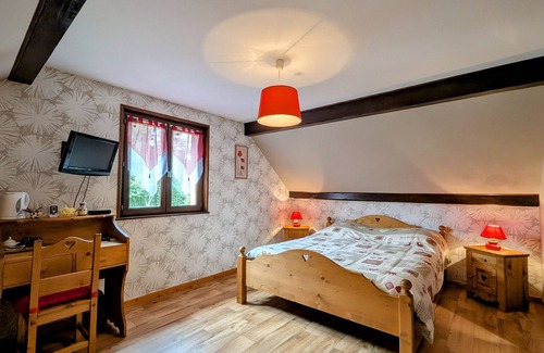 Subject to access hours, guests can enjoy the house's facilities, including a beautiful 10 x 5 m swimming pool heated by solar panels (from June 1st to August 30th), a summer terrace, and fitness equipment. Indoor spa available year-round (€25 per session), a hammam (€30 per session), and for your well-being, advice and foot reflexology sessions (€30 for a half hour or €55 for an hour, upon reservation). On the first floor of a large house, the Family Room consists of two bedrooms (the Heart Room and the Fir Room, each with a 160/200 cm bed). The Fir Room has a balcony. There is an en-suite shower room with toilet and sink. The private bathroom (bathtub, shower) is not en-suite. Breakfast is included in the price of your bed and breakfast, so you can start your day off right.