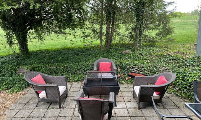 Relax with your whole family or maybe a small group. The 3 bedrooms and 2.5 bathrooms, can accommodate multiple people. We also have a full couch in the living room to fit at least 2 people and a blow-up mattress, if needed. Private patio with fire pit, grill, seating area on the 18th hole. A private pool for the residents of Eastbay, 18 hole golf course, clubhouse with a pool, bar and Sahm's restaurant and Tiki Bar. 15-20 minutes to IU's campus and 5 minutes from Lake Monroe beach, hiking trails & marina.