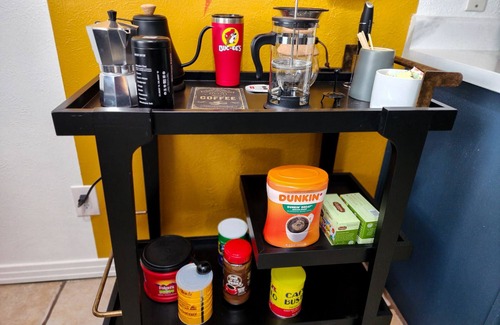Work from our desk space or use the fast and reliable internet for streaming and gaming, we have a 55 inch Smart TV for any needs. Come together in the the open living and dining area with modern and comfortable seating. Craft a cocktail with our bartender mixing set, cook in a full kitchen equipped with all the necessary utensils, and have a seat at the table. Enjoy the coffee and tea bar throughout your stay!!