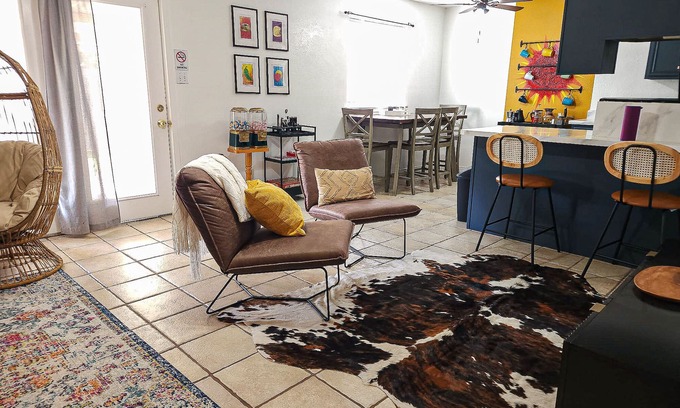 Comfortable. Quiet. Clean. Modern. Safe & Central. Enjoy easy access to everything from this centrally located stylish home. This convenient 3 bedroom, 2 bath house comes with wifi, parking, available laundry & meal prep service for qualifying stays. Enjoy board games, use of bar equipment, a full kitchen, 55 inch smart TV, exercise equipment, and a coffee bar. The back porch is surrounded with a friendly play area, and a bbq grill. The property has exterior cameras and designated parking for your safety.