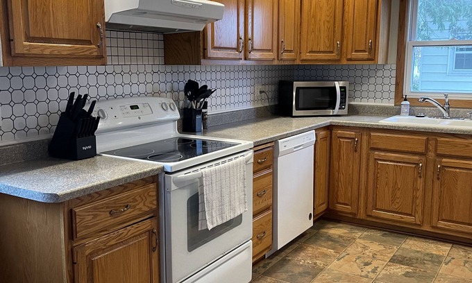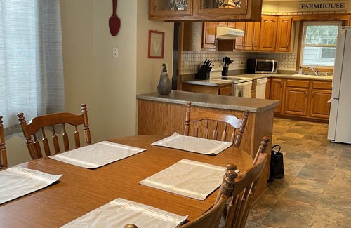This lovely home has three full bedrooms plus several flex spaces for game or TV time. There's a nice yard and deck for outdoor entertaining. There are two bathrooms (one with shower over tub and one with stall shower.) We provide sheets, pillows, blankets plus towels for your enjoyment. Our kitchen is equipped with appliances, utensils, dishes, coffee maker and cookware.