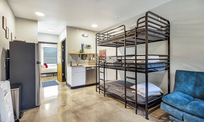 This is the perfect suite for a couple, friends or sleepovers. Pet friendly space located on the second floor. This suite offers a flexible living space. 1 private queen bedroom, full bathroom, and kitchenette. Sleep 3 extra in a set of triple bunks in the main area. There is a great community space in the hotel with pool and ping pong tables, games, train and legos. There is something for everyone in the family here.