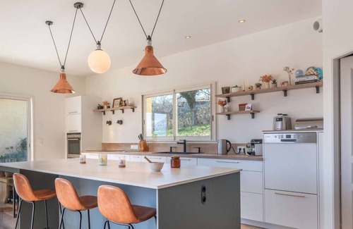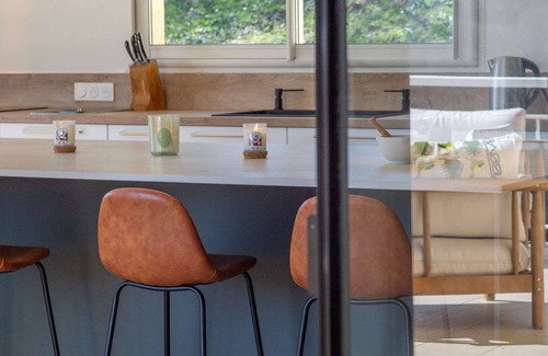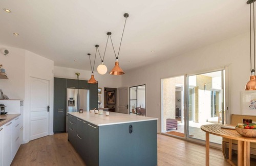 The bright living area opens onto a modern kitchen equipped with a central island, creating a convivial space perfect for sharing moments with family or friends.