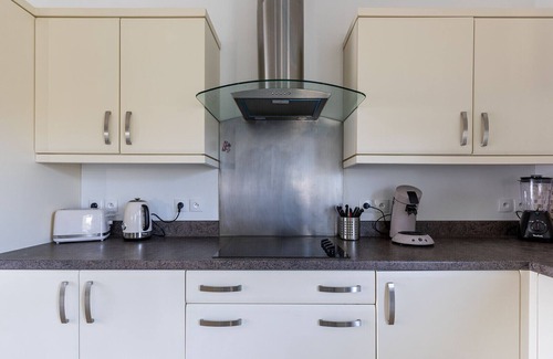 Large living room with fully-equipped kitchen, 5 bedrooms (including 2 master suites) and 1 further bathroom, making a total of 3.