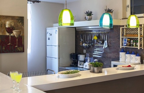 While the exterior showcases Mediterranean architecture, inside the villa has a modern and stylish look with its clean white furniture and up-to-date facilities. The spacious living room beckons with a cozy corner sofa and a television for leisurely evenings in. Flowing seamlessly from the living area, the kitchen and dining room dazzle with vibrant, colorful lights, creating an inviting ambiance for shared meals and lively conversations.
