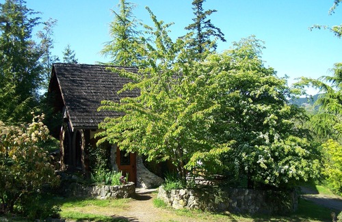 The Gnome House is a one-of-a-kind, hand-crafted, timber-framed Orcas Island cottage constructed with massive timbers, cedar arches, and hand carved tree trunk posts.