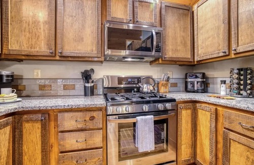 The well appointed kitchen is directly to the left as you enter. It has all the comforts of home including a dishwasher, refrigerator, microwave and gas range and oven. There are two different coffee options; drip coffee maker and Keurig. It has a toaster, waffle maker, air fryer, blender and mixer.