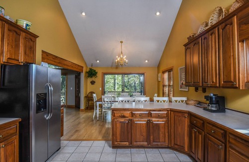 The spacious great room on the main level provides your group with plentiful room to stretch out and relax on the sectional sofa. Watch TV or pop in a DVD as you warm up by the floor-to-ceiling fireplace. A wall of windows lets in lots of natural light and reveals scenic views.