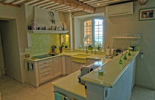 - A large living room with a fully equipped open kitchen, with dining and sitting areas. It has an attractive wooden beam ceiling providing a Provençal atmosphere. (45 m2)