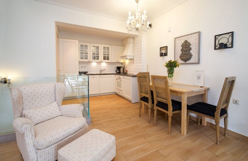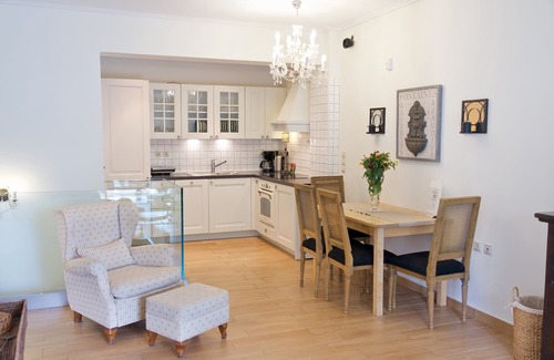 Zoe is a 130 m2 duplex awarded apartment (TrAdr award of excellence), comprising of two floors. The first floor offers an open-plan living, kitchen and dining area with patio doors leading to a terrace. In the living area there is a comfortable sofa, an armchair, stool, coffee table, dining table with chairs and a large buffet, TV, home cinema, large collection of DVD movies and a fabulous marble fireplace. The kitchen is fully equipped with full size fridge/freezer, dishwasher, microwave, toaster, coffee maker, SMEG hob and oven, chinaware, glassware, cooking utensils/pots & cutlery. A small utility room contains a washing machine. There is also a separate double bedroom with full mirrored wardrobe and patio windows to the terrace and sea view. There is a separate hydromassage bathroom. The terrace has a large dining table with 6 chairs and a stunning view to the sea and Ithaka. There are stairs leading from the terrace to the private garden (69m2) which is equipped with sun loungers, a large umbrella and a BBQ.