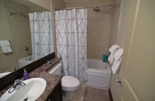 Quiet top floor suite with mountain views that features a cozy living room with fireplace and sofa bed including HDTV, Chromecast, DVD player, DVDs and board games to make your stay more enjoyable. Main bedroom has a comfortable king size bed. We have a fully equipped kitchen and in suite laundry for your convenience. Enjoy access to all amenities including underground heated parking, fitness room, pool, hot tub and steam room. Just 5 min from the hill and a short walk to restaurants & bars.