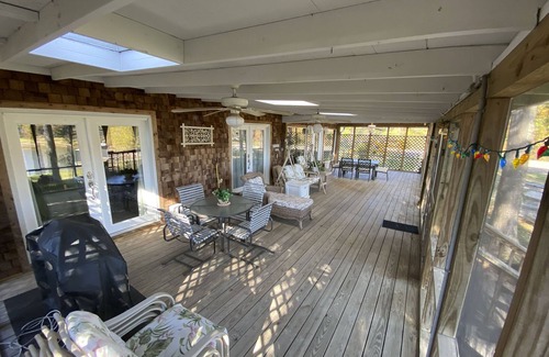 The expansive porch runs the width of the home and has 2 tables with total seating for 10, a 2-seater porch swing, recliner, 3 ceiling fans and gas grill. Gather around the tables to share a meal with family or friends or relish in the scenic solitude by simply listening to the lapping of the water. Two of the bedrooms have private entries to the porch, along with direct views of the water.