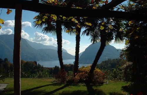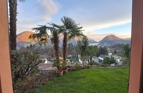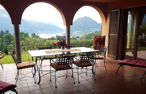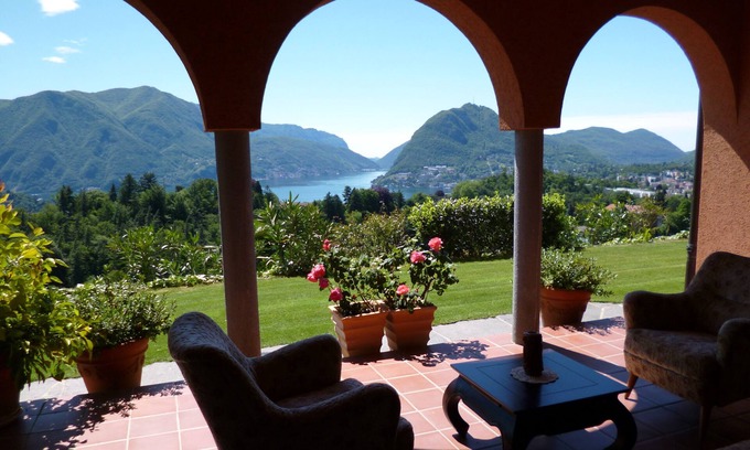 This elegant 4 ½ room-apartment (approx. 150 m2) is situated on the ground floor of a mediterrenean villa (only 2 units) in the sunny hills above Lugano, surrounded by a beautiful tropical garden with amazing lake-view. 3 double-bedrooms (6 p.), tube/shower/WC, shower/WC, guest-WC, open-space living-/dining-room/kitchen, covered terrace, wine-bower with outdoors dining table and chairs where guests can enjoy a delightful ‘Al fresco’ dining experience, overlooking the breathtaking Lake Lugano. Private garden, private heated indoor swimmingpool (14m x 5m) to share with the owner, 2 private parkings, free WiFi, Smart-TV. Non-Smoking. Enjoy the luxury of a private villa in breathtaking surroundings. Exclusive neighborhood of stately mansions.