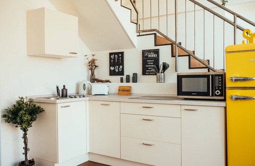 This beautiful Loft is situated in an former office building. Located on the 5th floor, the bright home offers space for up to 7 people on 76 m². The apartment is accessible via the elevator or the staircase. The loft extends over 2 floors and is furnished with a dining table, comfortable sofa, Smart TV with ZattooLive TV function and 3 single beds. A queen size bed is visually separated in an alcove. The kitchenette is well equipped with dishwasher, stove, microwave, refrigerator with freezer, coffee maker, kettle and toaster. A bathroom with shower/WC are available. The highlight of the apartment is the large terrace and the beautiful floor-to-ceiling windows. Explore Berlin like a local and benefit from the freshliy renovated loft and the good connection to the city center.