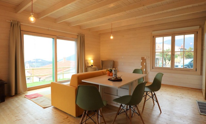 Small house with a fantastic view, wooden floor, really sunny, all build with ecologic mind. It's ideal for a couple or small family or friends, max 4 people. It's a really big room with a kitchen corner, a sofa bed, a double bed, a really beautiful bathroom, a terrace and a garden.