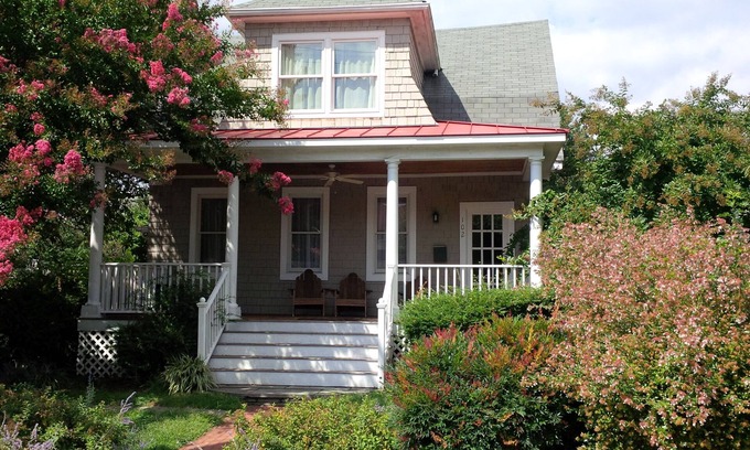This delightful house features numerous amenities tailored for both relaxation and entertainment. Enjoy a spacious front porch where you can sip coffee or toast to love as you take in the serene surroundings. The large, fully fenced backyard is perfect for outdoor ceremonies or receptions, surrounded by greenery to create a romantic setting. Additionally, the home boasts off-street parking for up to six cars, ensuring that your guests can easily come and go throughout your special day. With comfortable rooms decorated with Annapolis charm, this home invites you to create lasting memories.
