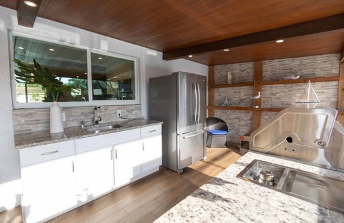 The open-concept living and kitchen space is light and bright and makes any gathering feel special. And whether you plan to entertain outdoors or just lounge the day away, the outdoor living space and completely unique pool with waterfall delivers on all fronts, providing a unique and comfortable spot day or night.