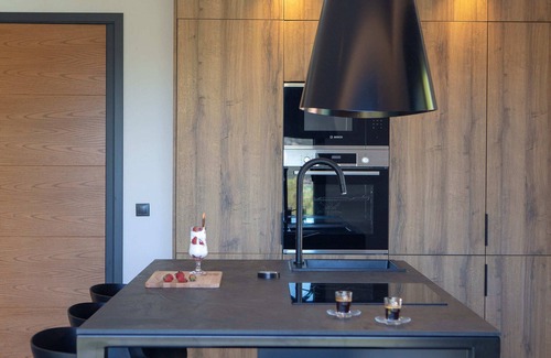 The house offers one bedroom and a bathroom that can accommodate up to 4 guests. We have created a unique dining room, by transforming the kitchen island into a cooking and eating meeting point since the kitchen hobs are surrounded by comfortable stools.