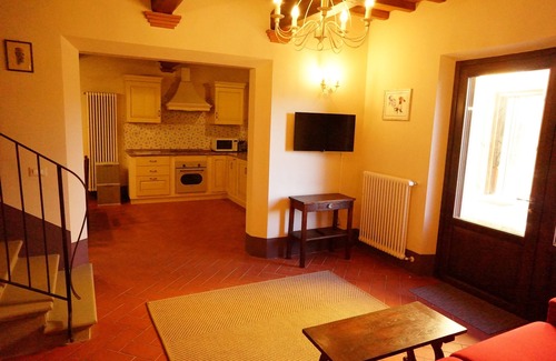 "I Millefiori" celebrates the abundance of flowers which grow on the property and is furnished and decorated in traditional Tuscan style. The entry area has a TV and a sofa bed which can easily sleep two additional guests at no extra charge. To one side of the entry area is a bedroom with 2 single beds, which is easily accessible by wheelchair. The adjacent bathroom has an open shower suitable also for wheelchair access. To the other side of the entry area is a well-equipped modern kitchen with an induction stove, an electric oven, and a dishwasher. There is a large indoor dining table next to the kitchen, and directly outside is a covered veranda with another large dining table and a spectacular view over the valley below. Upstairs consists of 3 bedrooms (each with a large bed) and 2 bathrooms (1 with shower, 1 with bathtub).