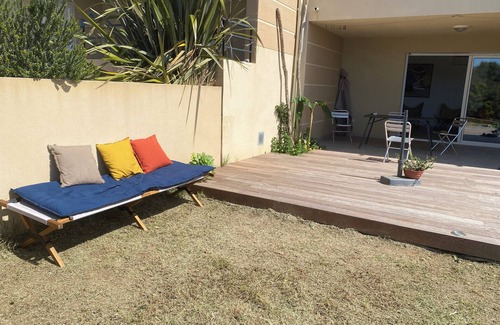 Appartement neuf très agréable, climatisé, en rez de jardin dans un petit immeuble de 1 étage, parfaitement au calme et avec une vue sur la mer, meublé avec goût , bénéficiant d’une cuisine très équipée de 2 terrasses ( une petite au niveau de la chambre et une grande attenant au salon et donnant sur le jardin. Terrasse couverte se continuant sur une belle terrasse en bois, pour admirer le coucher du soleil de son transat . La plage de sable fin est accessible à pied ( environ 700 m). Proche de st Florent pour aller manger une glace sur le port et merveilleux départ pour découvrir le cap corse . des ballades sont possibles a pied ou en vélo à partir de la location. A 30 min en voiture de Bastia . Parking gratuit et privé
