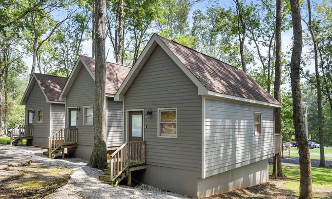 The Lower Cabin is a brand new (November '23) ADA accessible cabin with fantastic views! It features parking right outside the cabin and a ramp entrance. The cabin has two private, plush bedrooms. The first bedroom features a bunk bed with a queen bed on the bottom and a twin XL on the top, top bunk is accessed by stairs. The second bedroom features two bunks with queen beds on the bottom and twin XL beds on the top. The Lower Cabin has a full kitchen, spacious bathroom with roll in shower and a deck on the back overlooking the pond and surrounding property. Bed linens and towels included. Many modern amenities including Wi-Fi & smart TV!