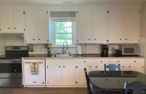The cottage sits off of a country road and down a long driveway lined with horse pastures and is located next to the main farmhouse. The driveway continues past the farmhouse and down to the horse barn complete with chicken coup and a retired milking barn remaining from when the farm was a working dairy farm.