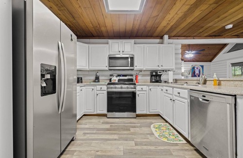 This freshly painted log cabin is beautifully decorated, comfortable, and private. Two of the bedrooms feature queen-sized mattresses, while the third bedroom has two twin-sized beds. There are 2 bathrooms along with a laundry room located conveniently inside the cabin. The kitchen is stocked with all your cooking needs such as pots, pans, baking sheets, blender, toaster, coffee maker, and more! There is also a BBQ grill and fire pit are available for your use, with BBQ tools provided inside the kitchen.