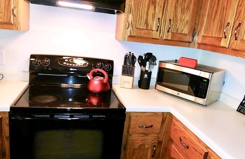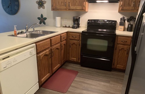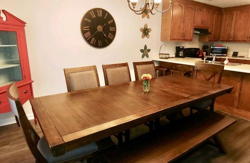 Bedroom one has a king size bed and attached bathroom. Bedroom two has two full beds. Dining table has seating for eight, plenty of room for everyone to sit down together. The kitchen is fully equipped with dishes, flatware, cookware, utensils, blender, electric griddle, and toaster, everything you need to prepare a meal.
