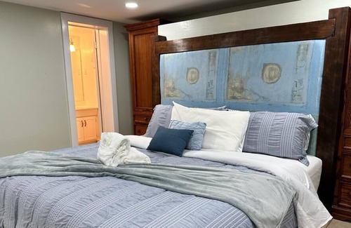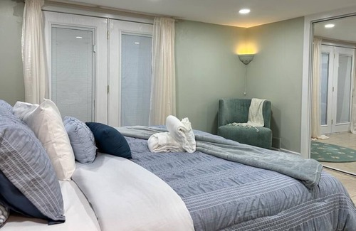 The lower level of the house has two more bedrooms, one with a king-size bed and an en-suite bathroom, and another with a queen-size bed. This level also features a second living room space with a full sofa and mini kitchen, providing the perfect space to relax and unwind. For your convenience, we also have two additional apartments, each with one bedroom, one bathroom, and a mini kitchen.