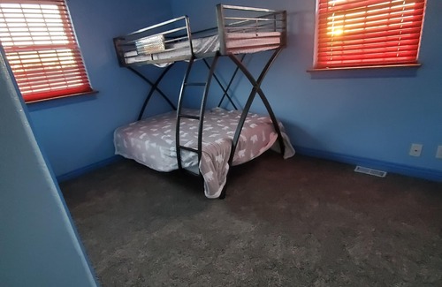This property has plenty of RV and trailer parking available. This is a two bedroom home with loft. Master (queen) has outside balcony with seating. Second bedroom has bunk bed (full/twin) perfect for kids but comfortable for adults. Loft has small sectional with a queen pullout. 32" flat screen with blue ray. Living room also has small sectional with queen pullout and 65" RoKu Smart TV. Dinning table is set for 8 but breakfast bar has 3 additional seats. (Air mattress available for additional sleeping arrangements if needed).