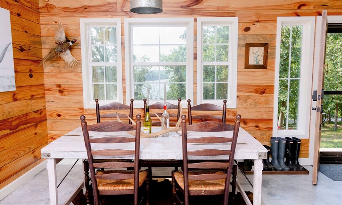 Scenic walking trail to secluded beach where you can fish, kayak, watch the sunset or swim. Build a fire in the fire pit and relax as you take in the beautiful surroundings. Easily accommodates large families. You will thoroughly enjoy this nature in the woods.
