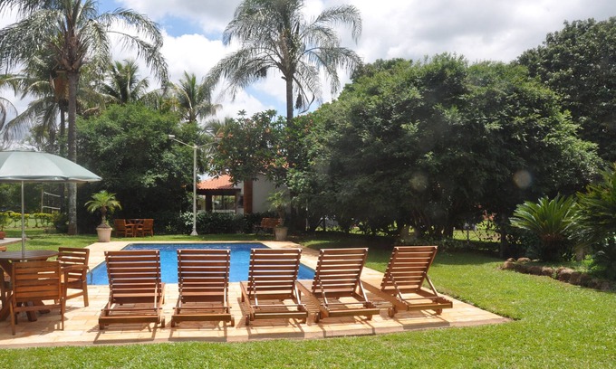 Farm with large lawn, located in the urban area of the city, all wooded, surrounded by fence that allows security for pets, orchard, house of 260 m² with 01 suite with air conditioning, 32 "smar tv and fan, 02 rooms with air conditioning and fan, 02 bathrooms, large living / dining room, fully equipped kitchen, pantry, 02 balconies, external and internal barbecue. Free hifi, 10x05 m pool. Game kiosk with pool table, foosball and card table with full bathroom. The owners live in the farm next door, providing good service to guests. Outdoor lighting of the recreation area. Free hifi. At the entrance guests will be greeted with a special gift from Chácara dos Coqueiros and will have for immediate use soaps, toilet paper, coffee powder, sugar and salt. Bed and bath linen are optional and may be available for a fee upon check-in.