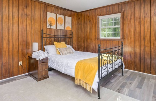 5-Acre Property | Free WiFi | 1,900 Sq Ft Bedroom 1: King Bed | Bedroom 2: Queen Bed | Bedroom 3: Queen Bed | Living Room: 2 Full Futons and additional mattresses in TV Room. HOME FEATURES: Smart TVs, dining table, ceiling fans, fireplace, high chair, outdoor dining area, garden, gas grill KITCHEN: Refrigerator, stove/oven, coffee maker, microwave, dishwasher, dishware & flatware GENERAL: Washer & dryer, towels, linens, complimentary toiletries, central air conditioning/heat BASEMENT : 1300 Sq Ft basement Game Room with Air Hockey, Table Tennis, Mechanical Guitar and Axe Game FAQ: No access to Barn/sheds ACCESSIBILITY: 2 steps required for access PARKING: Garage (2 vehicles), driveway (2 vehicles), RV/trailer parking in the back of the house