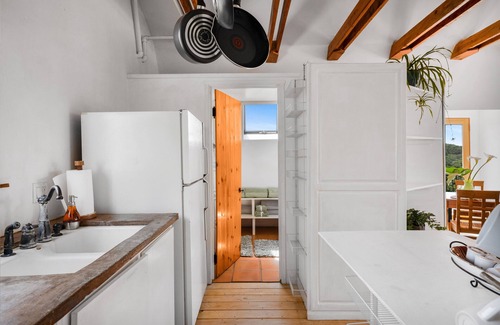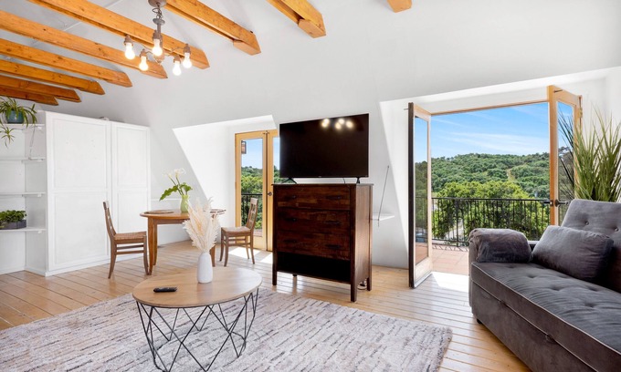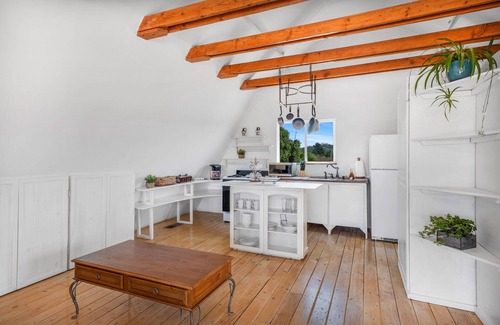 The studio boasts an open layout, designed to maximize space and natural light. The main living area is thoughtfully furnished with a comfortable queen-sized bed, plush seating, and a small dining area. Relax on the couch while enjoying the panoramic views of rolling hills and lush green pastures through the large windows.