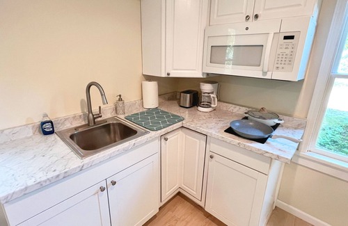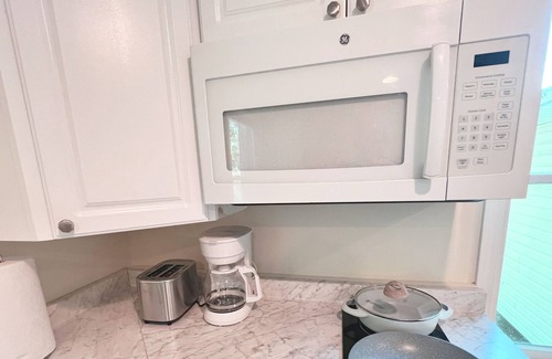 The kitchenette has an electric cooktop, coffee maker, toaster, microwave, and refrigerator.
