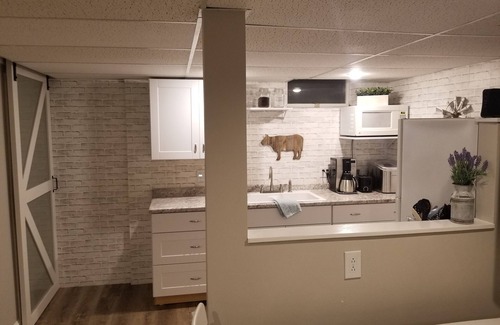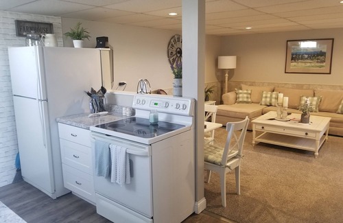 The Farmhouse at Lake Mac is truly a historic 1908 farmhouse that was moved to Lake Mac and updated in 1980. We sit just up the hill from Admiral’s Cove resort and Lemoyne Boat Launch and is a short half mile walk to the beach and bar. The covered front porch has views of the lake and sunsets while the walk out apartment has its own entry with so much privacy from the screen of cedar trees surrounding the yard, you’ll feel like you’re all alone!