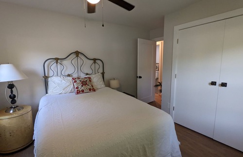 The bedrooms are up one step with wood flooring and large windows, all with black out curtains. The front bedroom has a large closet and large window facing a lovely tree. It has a closet with a small dresser. The back bedroom has a door to a patio, a small desk that can easily be moved where works best for you, and a large walk in closet.