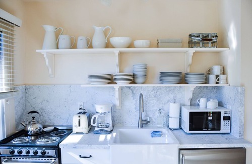The Farmhouse is a three-bedroom, two-bathroom cottage with small kitchen, wood-burning fireplace, dining table, living area and French doors that open onto a private patio and lawn. The farmhouse has stunning views of the vineyards, valley and western hills from your living room, bedrooms and outdoor space. The front of the farmhouse has a lawn, BBQ, large outdoor dining table and a grouping of