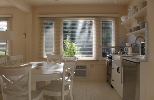 The Arrowhead Cottage is a one bedroom stand alone, with a private entrance and bathroom, and is separate, but close to the Farmhouse. It is appointed with new furniture, down comforters, luxury cotton linens, flat-screen TV, wifi, microwave and coffee maker. The French doors open onto your own patio and lawn with dining table and chairs, cushioned lounge chairs and deep-seating sofa and armchairs surrounding an outdoor fireplace that is original to the property.