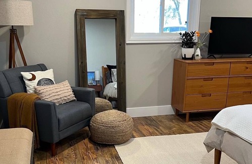 Rest and relax in this charming farm house set in the prettiest little apple orchard. We are a small hobby apple orchard with over 165 apple trees, and over 30 different varieties of apples. Every Fall the orchard comes to life with picking, sorting and pressing of our organic apples. We produce the best tasting raw, fresh apple cider on the planet! The farmhouse is a fun 3 bedroom home with tons of room to visit, read a book, entertain, or cook for your family.